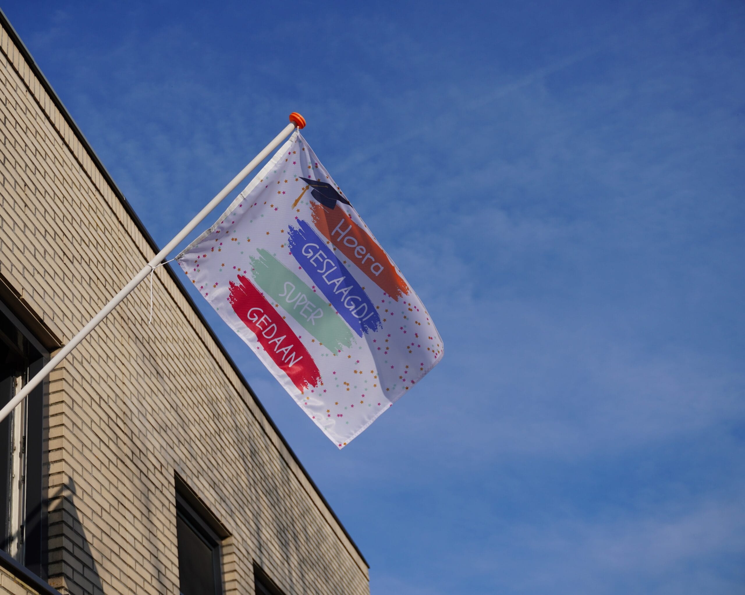 Deze geslaagd vlag is gemaakt van hoogwaardig glanspolyester (115 gr/m²), waardoor hij een luxe uitstraling heeft en mooi wappert in de wind. Dankzij de witte lus en het koord is de vlag eenvoudig op te hangen en blijft hij stevig op zijn plek. De afwerkingszijde is links, wat hem geschikt maakt voor de meeste vlaggenstokken en ophangsystemen. Laat iedereen weten dat er iets te vieren is en geef de geslaagde de eer die hij of zij verdient! Materiaal: 115 gr/m² glanspolyester, licht en stevig Formaat: 100 x 70 cm, perfect zichtbaar voor voorbijgangers Afwerking: Witte lus en koord voor eenvoudige bevestiging Afwerkingszijde: Links, ideaal voor vlaggenstokken en ophangsystemen Weerbestendig: Geschikt voor buitengebruik, kleurvast en duurzaam